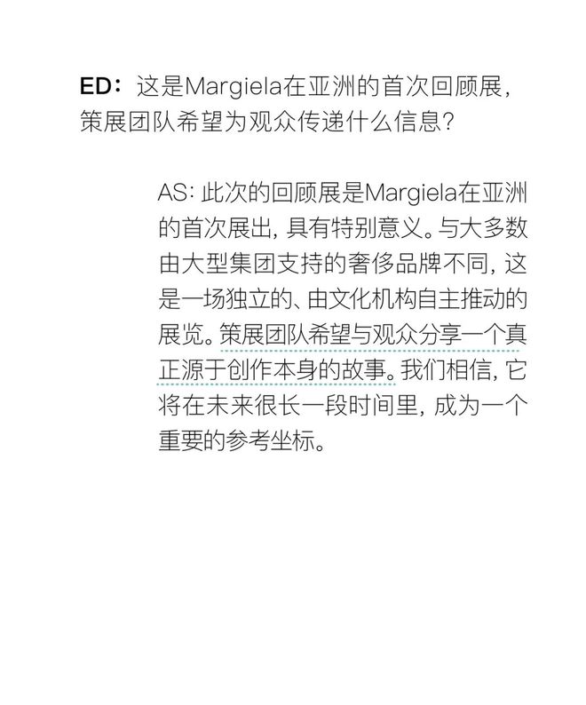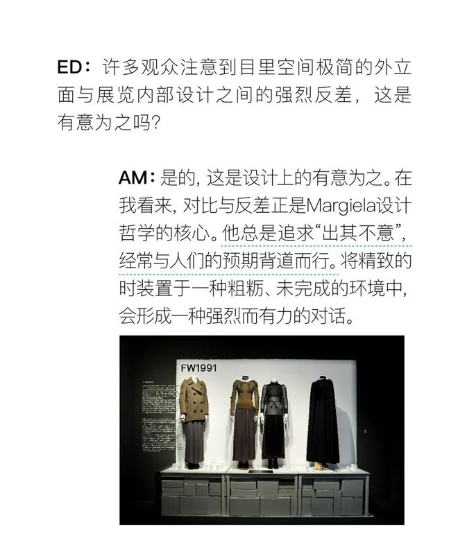 当被问及Margiela的“不在场”是否增加策展难度时,策展人Alexandre坦言:“恰恰相反。他的作品本身已具备完整的表达力。我们无需看见他的面容,便能理解他的愿景。“匿名”反而让人们更专注于服装与理念本身。”