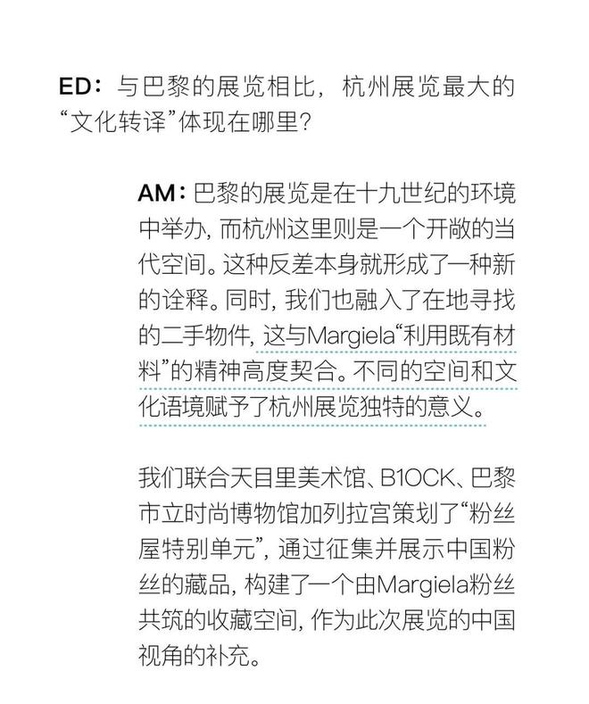 Martin Margiela的时装秀常常脱离既定舞台,走进地下夜店、废弃停车场、地铁站或仓库,消解观众与模特的界限。策展团队将这种精神移植至杭州的展览现场。