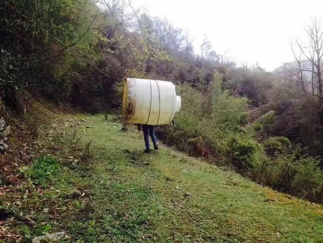 山上没有生活用水,最初,阿布只能背着50斤的水桶,一步一步爬向山顶。