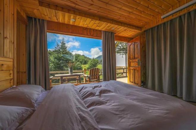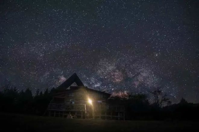 夜幕中,温暖的小木屋亮起暖黄的灯光,顶着闪烁的星空,勾勒出一张张明信片上的画面。