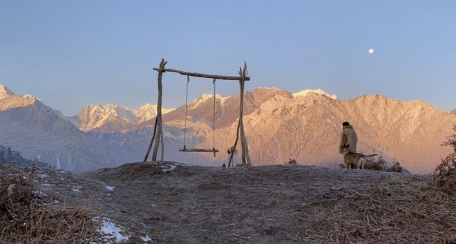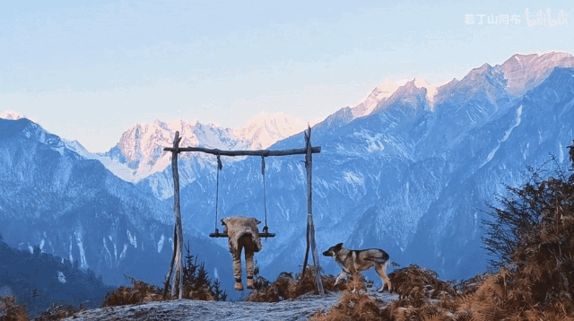 他带着狗狗爬上山顶,迎着雪山的注视,荡上几个秋千;