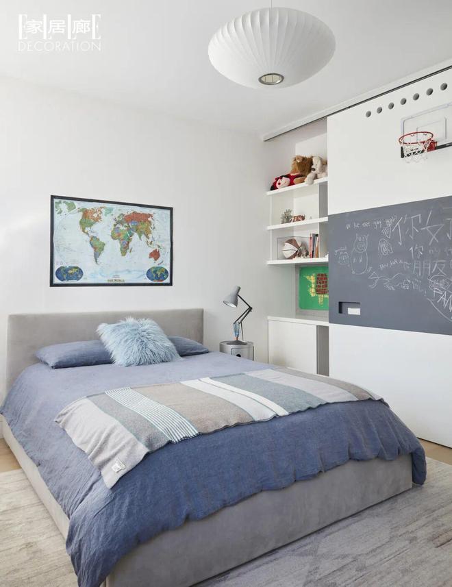 儿子卧室内,可滑动面板上特别设计了篮球架,