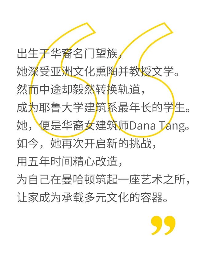 “我认为找到与自己的激情相符合的生活非常重要,我很清楚自己在建筑方面拥有天赋,如果不去利用它,我会觉得非常遗憾;人们都说这是一个充满竞争的世界,你必须先做第一步,再做第二步,接着做第三步,但我不相信人必须走一条直线,冒险和尝试新事物也很重要。生活不是短跑,而是马拉松,它是一个漫长而曲折的过程。”Dana说道。当然,正是这份对建筑的热忱,推动她一路突破,成为纽约知名事务所 Gluckman Tang 的合伙人之一。