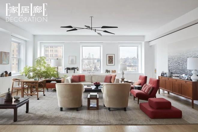 小客厅内,左前侧是BluDot的红色休闲椅,