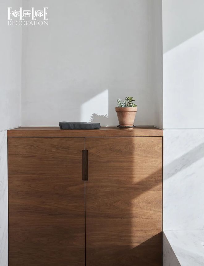温润铺满地板、家具,墙面大面积留白,绿植的影子在光的折射下,在白墙上留下摇曳姿态,家的空间里藏着自然的松弛与治愈。橱柜或是白色、或是和地板一样的橡木原色,这样空间里的艺术品或物品会产生有趣的投影,这也是Dana注重的设计细节。