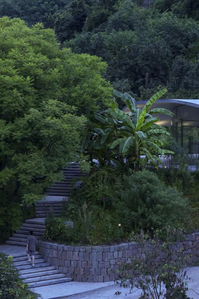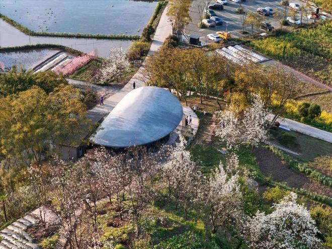 小隐建筑在梨花村入口打造的不在山林·山谷石窑,以梨花瓣与山谷巨石为意象,描绘出仿佛花瓣飘落巨石之上的轻盈姿态。建筑由曲面“花瓣”屋顶覆盖空间,掏空的“巨石”则藏着卫生间,玻璃界面让室内与自然环境融为一体。场地布局因地制宜,遮挡西侧道路与烈日,同时向东迎光,形成开敞庭院。内部独特的声学特性令声音回荡清脆,适合音乐演奏,使这一小建筑兼具功能、趣味与文化体验。