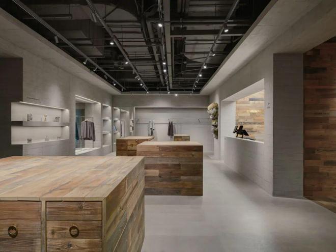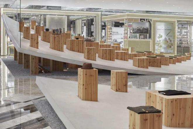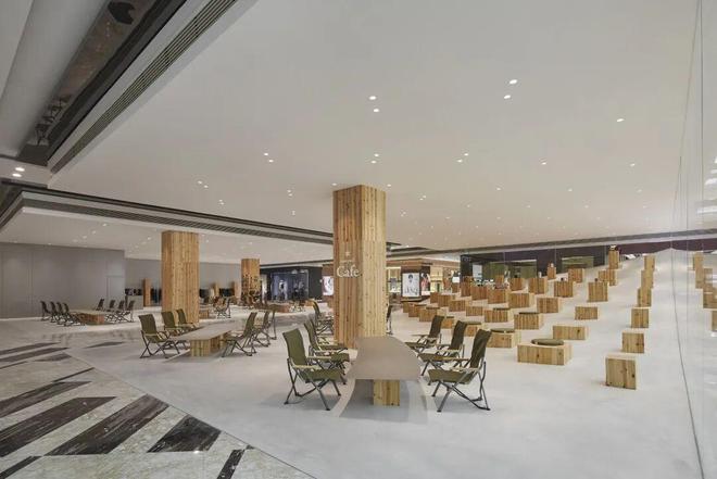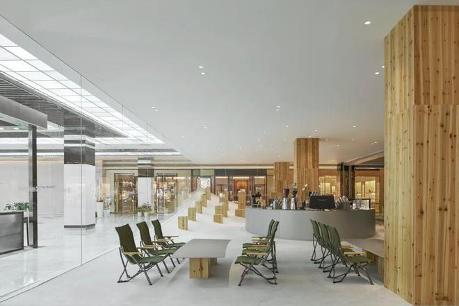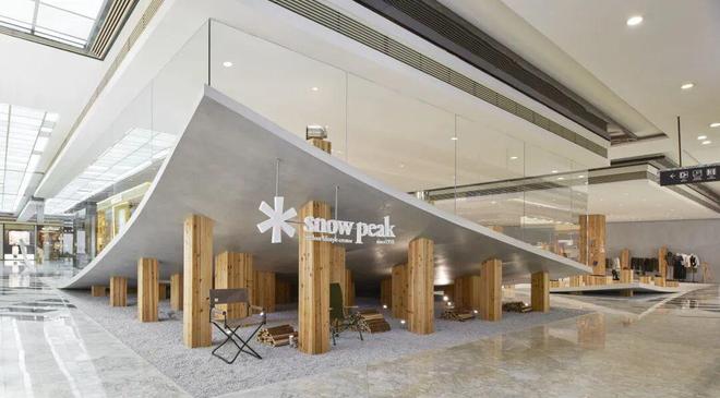 由KiKi建筑设计事务所设计的Snow Peak苏州店,以“高差”为概念,在商场内塑造出起伏的丘陵地貌,将自然体验融入商业空间。混凝土浇筑的缓坡模拟山形,错落木桩贯穿其中,兼具展架、坐具与结构功能,形成“坡地”与“密林”的交织。空间分为开放的体验场域与内向的景观层次,彼此视觉贯通。碎石与灯光点缀其间,在都市环境中诠释“野游人生”的品牌哲学,传递物与自然共生的户外美学。