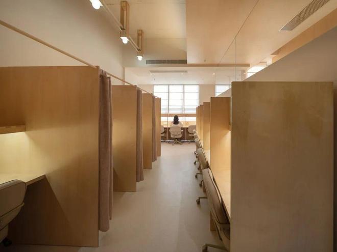 多么工作室在南京新街口高空打造的一处壹心空间自习室,以建筑学手法将桦木、织物与光编织成一个有机系统,营造出抽离城市喧嚣的精神容器。中央悬浮灯笼装置以木构包覆布料,随日光投射丰富光影,夜间则如梦境般柔和发光。空间通过攀爬路径串联多个立体功能区,顶部冥想舱可俯瞰城市。设计巧妙整合管线,将消防喷淋管转化为灯具结构件,长桌中心立柱兼顾走线与屏风悬挂。