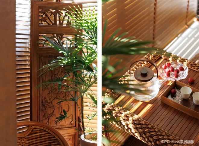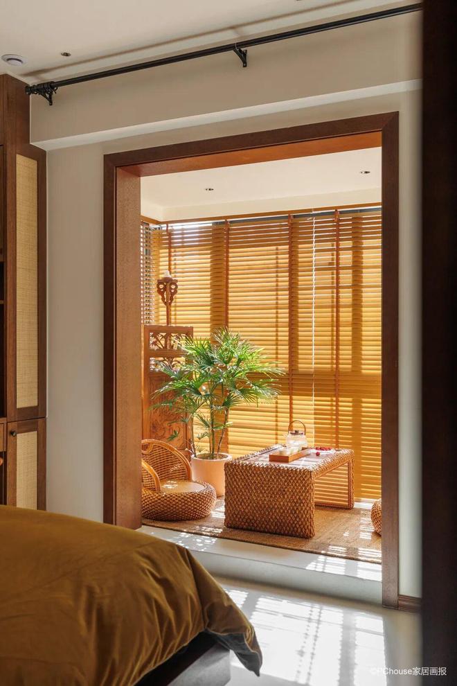 卧室里的小阳台被改造成品茶休憩的小空间,木百叶包围下,一张矮茶几、两张藤编靠背椅、散尾葵绿叶伸长、斑驳的日光洒在温热的茶香里,让人只觉岁月悠长。