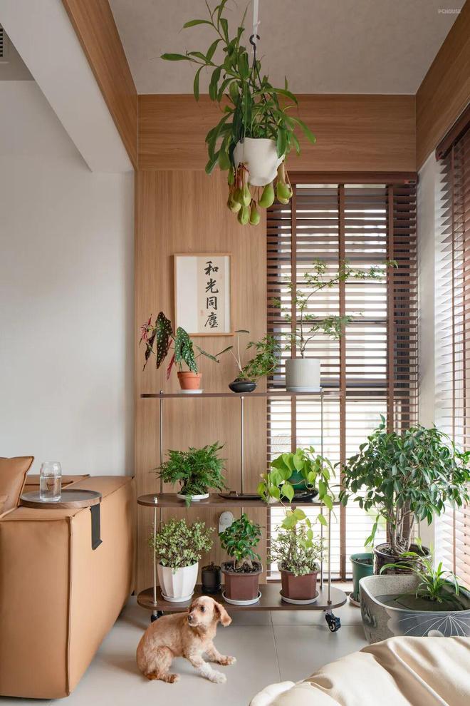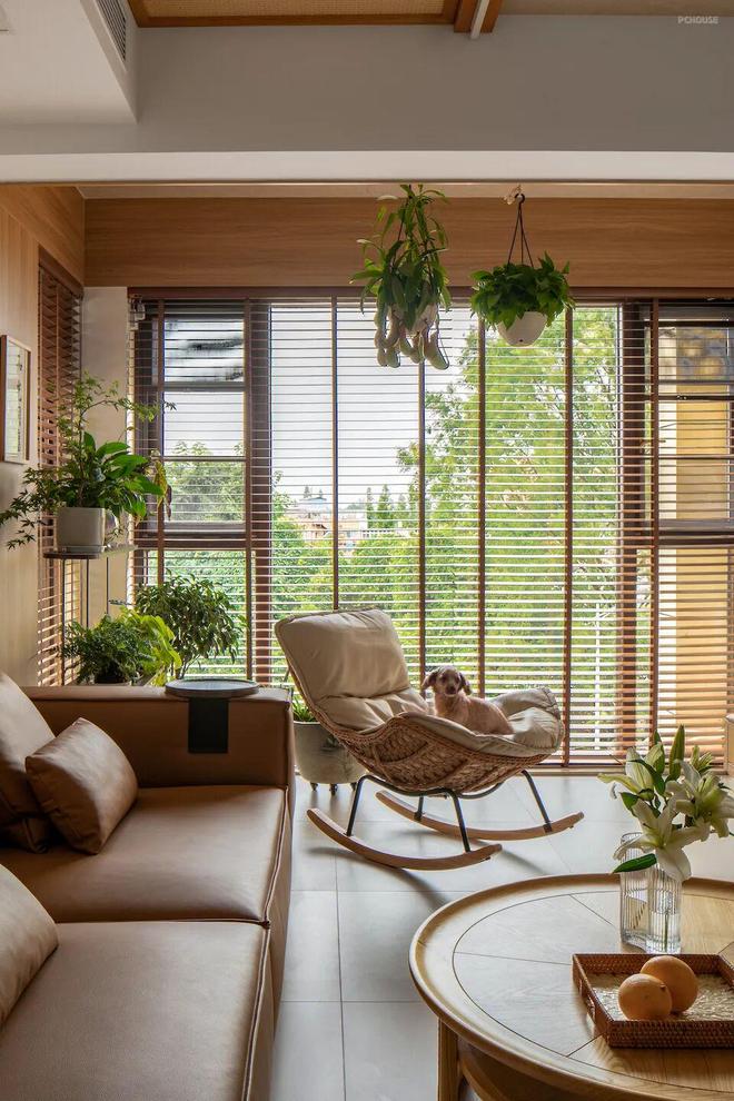 而在这个度假风情家里,鸡肋的客厅阳台被改造为一个可以躺卧、阅读、闲聊、品茶的阳光卡座空间,生机勃勃的绿植环绕,阳光透过百叶帘洒下朦胧的光影,微风伴随叶片发出窸窸窣窣的声响,时光在这里温柔悠长。