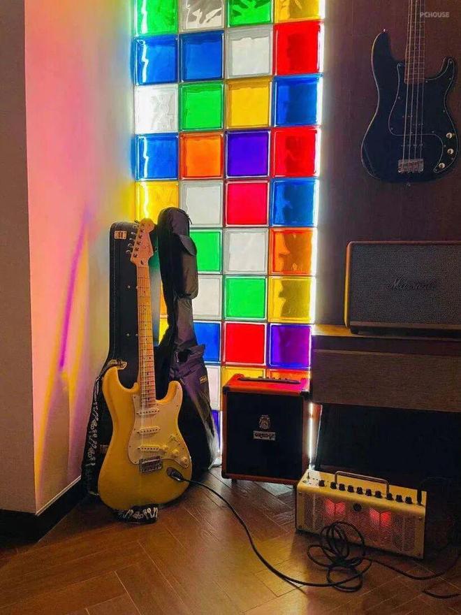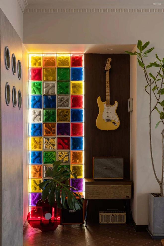 五彩的玻璃糖花砖渲染出斑斓的情绪,旁边摆放着吉他和收藏的复古音响设备。无论是播放自己喜爱的音乐,还是自己弹奏一曲,情调氛围都是满级的。