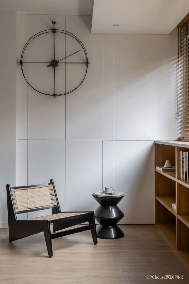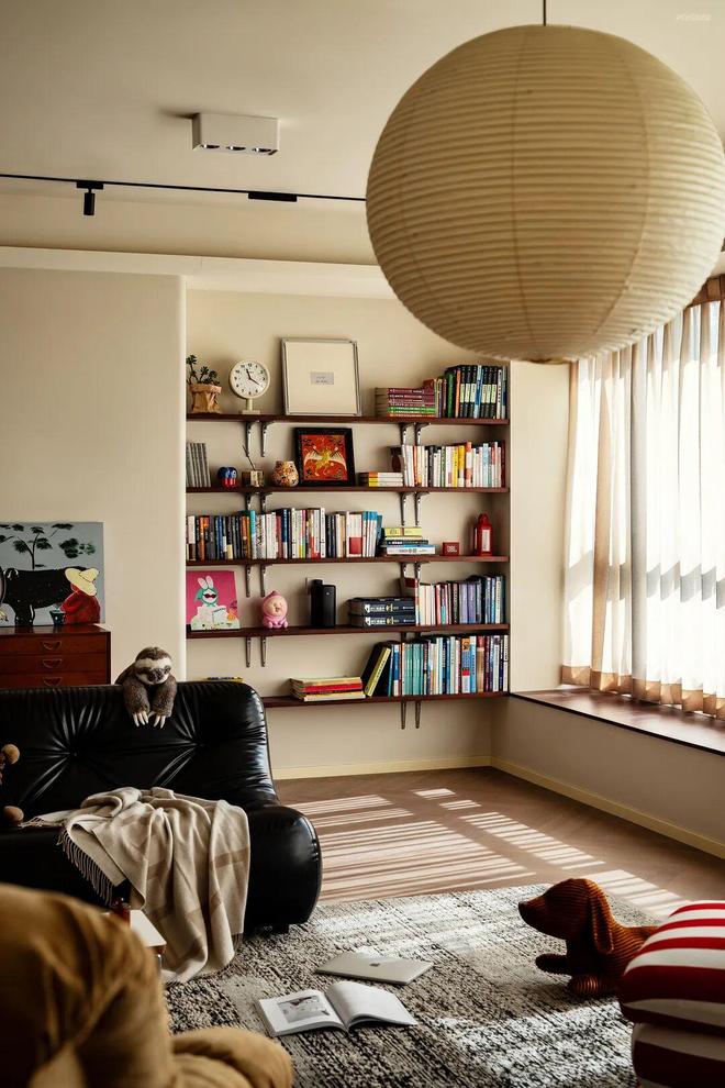 这个重庆屋主在客厅靠窗一隅搭建了一方休闲的阅读区域,惬意的单人沙发椅,靠窗一排矮书柜,旁边一张小几,木百叶裁剪柔和了日光,一杯茶、一本书,就是一个悠然自得的午后。