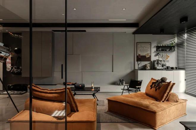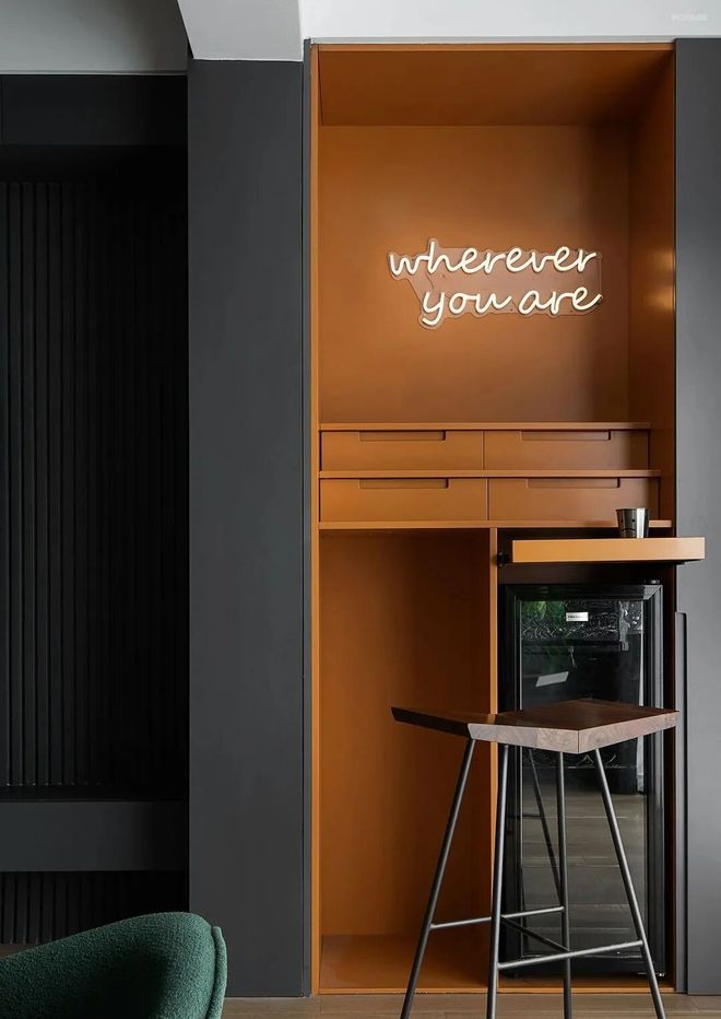 一抹爱马仕橙跳色在黑白灰的客厅里格外亮眼,搭配白色英文灯牌氛围感十足。晚上回家,一杯小酒便是下班后的“忘忧水”,缓解焦虑,治愈自我,虽然仅是小小的“格子间”,也足够享受这片刻悠闲。