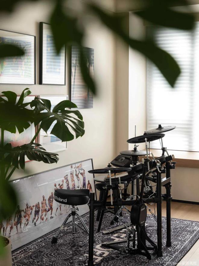 音乐是生活里绝佳的调节剂,更能为家居氛围“赋能”。在啧啧和可儿的家里,一进门就能瞧见主卧旁的绝美音乐角