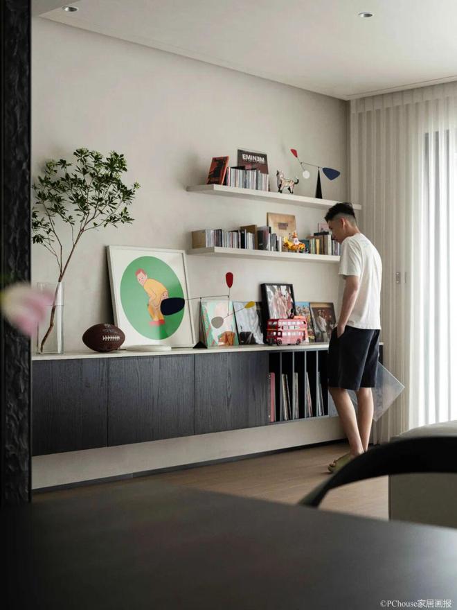 同样爱好音乐的深圳屋主则在沙发后定制了一排开阔实用的陈列展示架,用来展示与收纳其收藏的CD和唱片,以及其他喜欢的小物件,成为了一处被旋律填满的治愈系小角落。