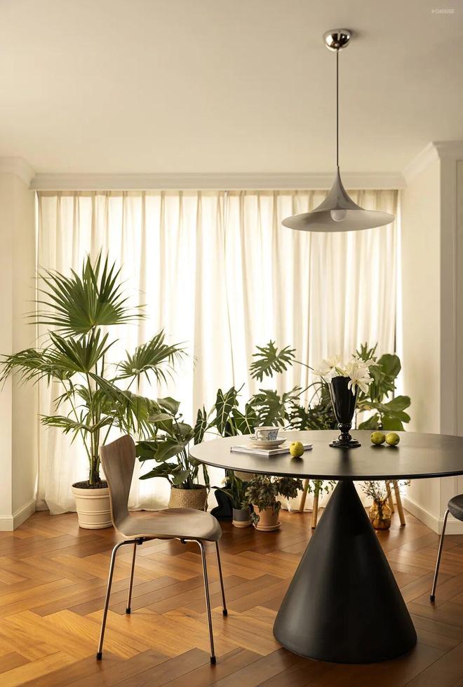 屋主在餐厅处布置了一个小小的植物角,枝叶婆娑的散尾葵、曼妙轻盈的春羽、温柔灵动的绿天鹅绒海芋……就如同置身森林餐厅一般,满眼绿意葱茏,鼻尖伴着沁鼻的植物清香,仿佛连饭菜都更香了。