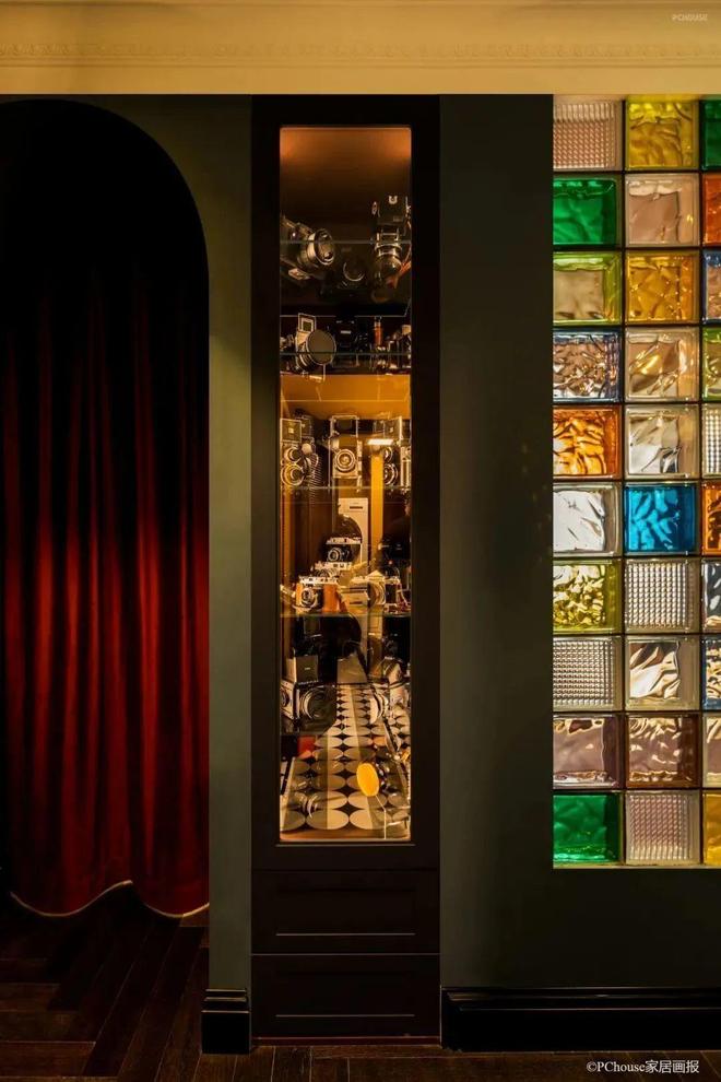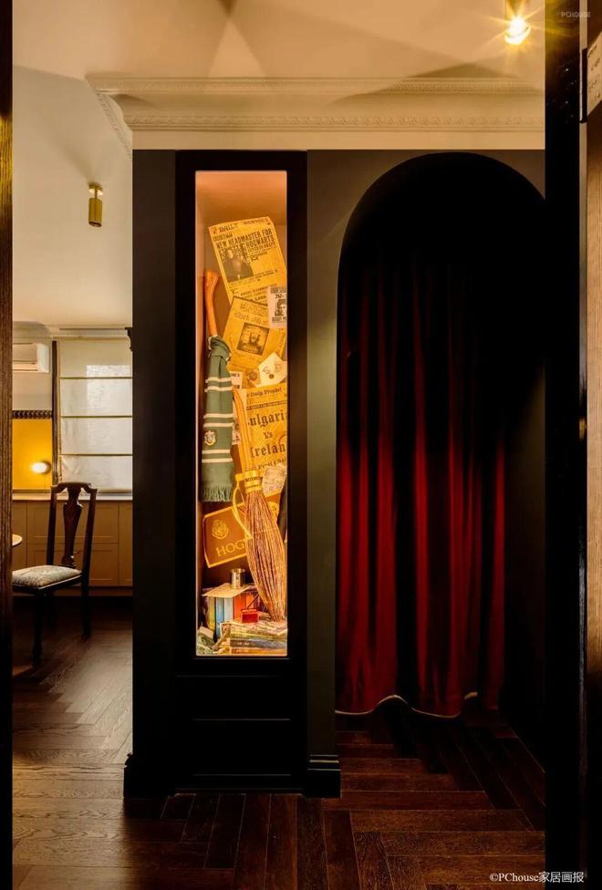 设计师在拱门的两边预留了两个凹墙,以英式橱窗为灵感,嵌入壁柜,用来陈列男女主的收藏。左边橱窗以哈利波特为主题,里面陈列着女主收藏的飞天扫帚和一些珍藏版小说;右边橱窗琳琅满目,都是男主的摄影器材。