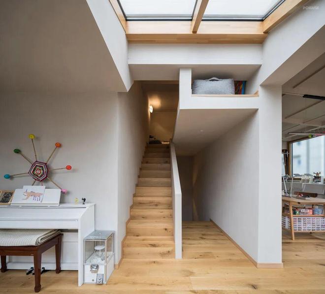 倾斜的窗户给整个阁楼空间带来了足够的采光,窗边的长柜上摆上几个软垫,坐在上面翻翻喜爱的书籍,画点随心的画,感受生活的慢节奏。
