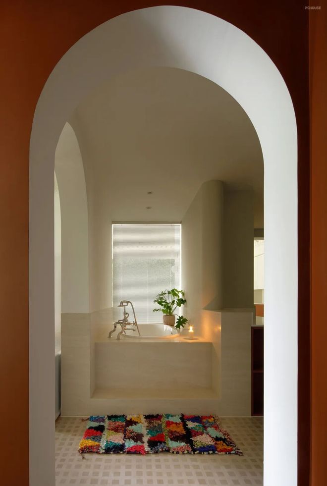 这届年轻人是懂享受的,下班回家泡个热水澡,可以说是朴素又有效的解压放松方式。如今的浴缸也不再禁锢在卫生间里,搬到阳台、搬进客厅、搬进卧室……怎么舒服怎么来。在这个独居女孩的度假氛围家里,浴缸被设置在了客厅环形动线的中,作为全屋最具度假感和仪式感的空间。