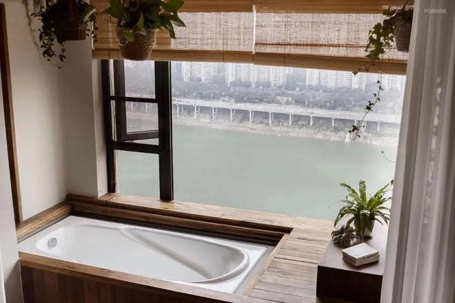 重庆建筑师易妹儿则把浴缸装在了客厅阳台。阳台用胡桃木色防腐木打造出日式氛围感,一侧嵌入浴缸,另一侧榻榻米内放置杂物。