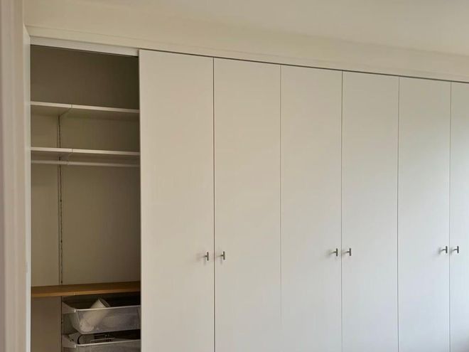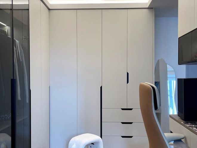 装修建议:通顶的柜门,建议大家采取分段式设计,一般可以分成2~3段,效果会更好。柜门的材料一定要选择易清洁、耐污染的饰面材料。