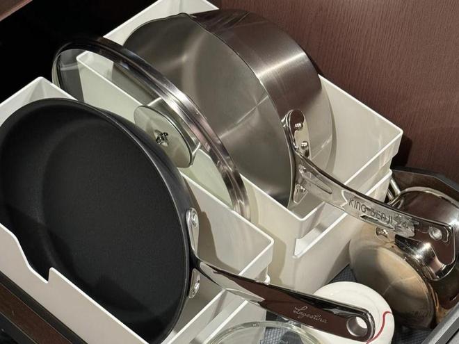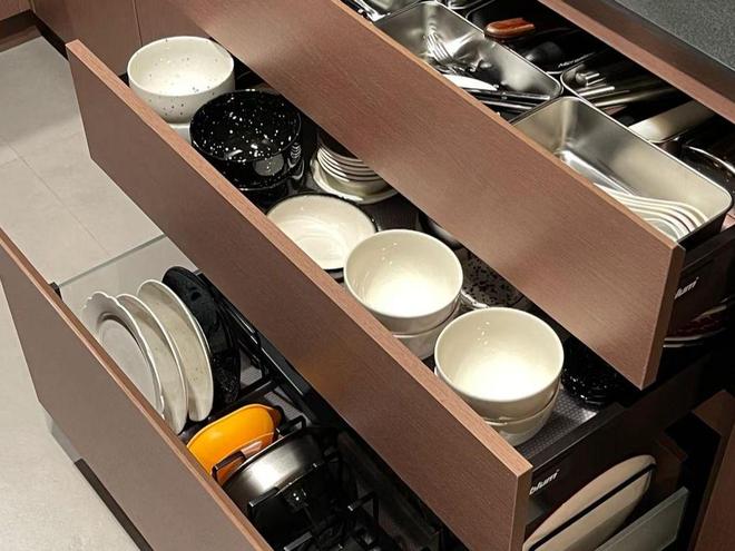 装修建议:抽拉式储物,一定要选择好的五金抽屉滑轨,要选品牌缓冲轨道。对于地柜,建议做抽屉与部分开门的组合,要平衡预算以及实用性。