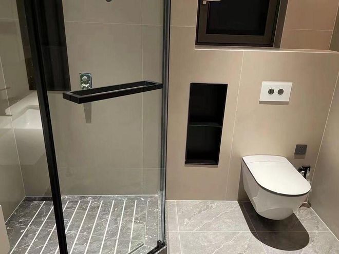 装修建议:壁挂式马桶需要提前安装支架,而且要确保墙面的强度,确定完成面的高度。而在假墙上方可以做成储物空间,也是很实用的。