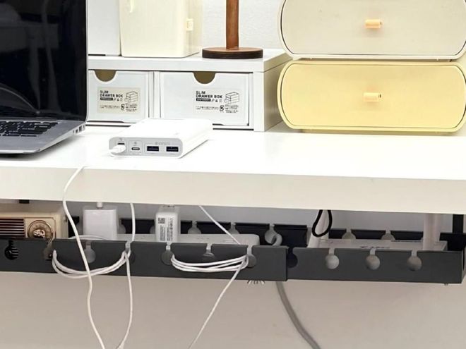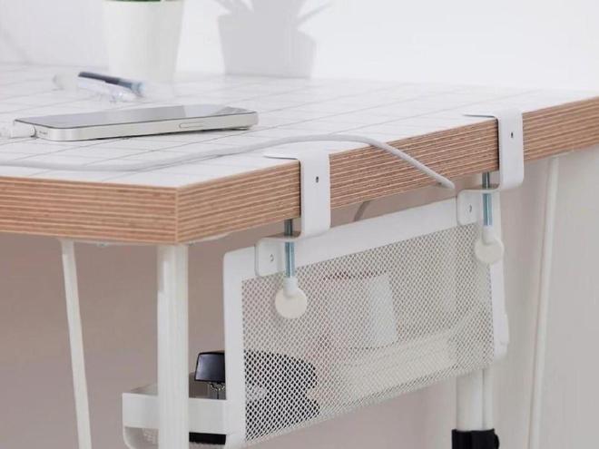 做法也不复杂,就是购买一个可以使用螺丝或者是纳米胶固定在桌面下面的插排收纳盒就可以了。