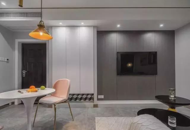 餐厅所占据的空间非常小,迷你的圆餐桌搭配两张粉色带金属的椅子。客厅的电视柜被舍弃,选择了做上大理石造型,简洁的饰面板作为电视背景墙,看着就很有现代感。