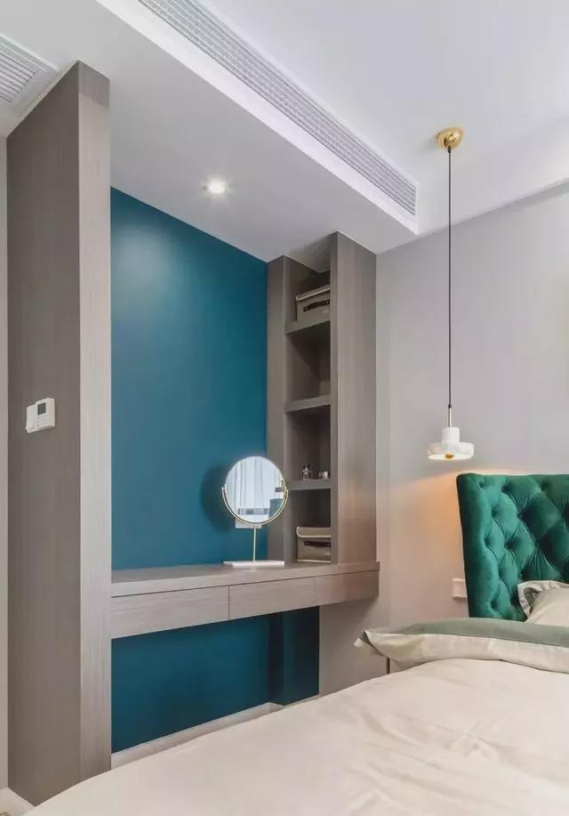 主卧室的背景同样选择了灰色调,孔雀绿的床头靠背款式非常大气。飘窗的窗帘选择了孔雀蓝的色调,整体简洁而又有格调感。