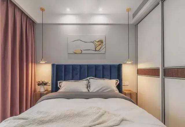 次卧连通了阳台空间,用推拉门来分开两个空间。粉色的窗帘搭配深蓝色的床头靠背,让人感觉静谧而又优雅浪漫。