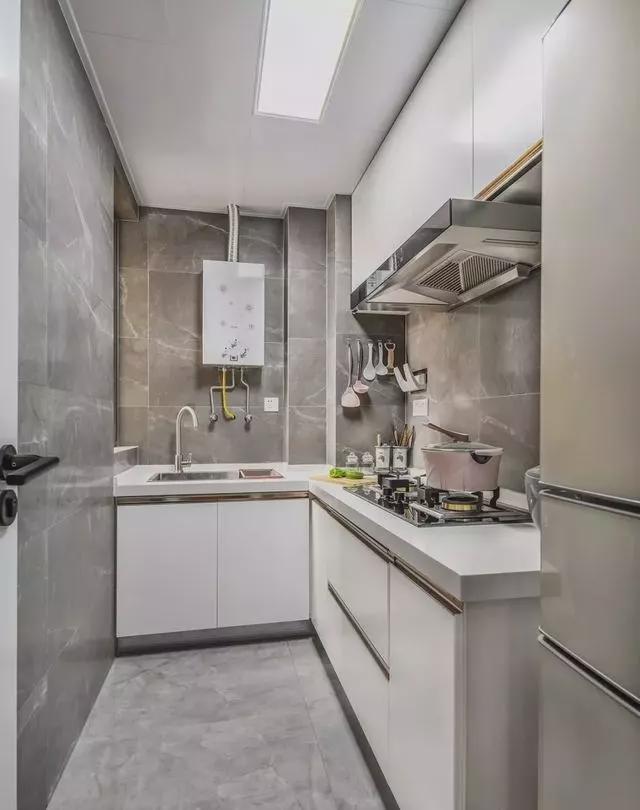 厨房内部空间比较小,做了L形的橱柜布局,冰箱摆放在橱柜的边上。灰色调的大理石瓷砖搭配白色的柜子,让厨房看起来简单又轻松。