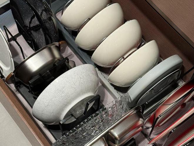 具体的做法是厨房的地柜80%以上都可以安装抽屉,采用抽屉式设计。而对于一些电器收纳柜,可以采用全拉出式的层板,衣柜也可以配备多规格的抽屉。