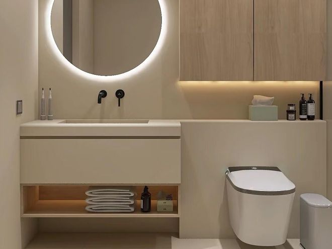 装修建议:壁挂式马桶需要提前安装支架,而且要确保墙面的强度,确定完成面的高度。而在假墙上方可以做成储物空间,也是很实用的。