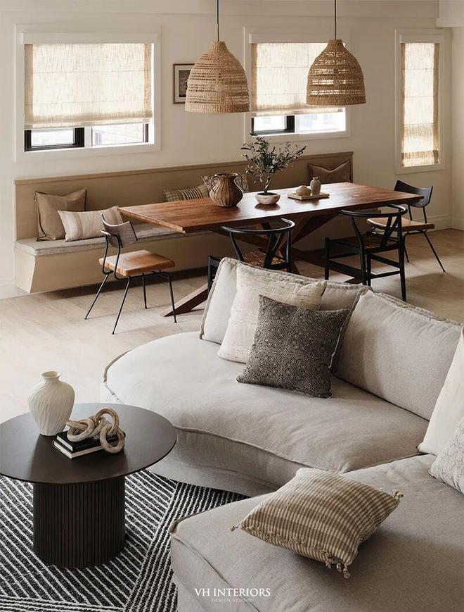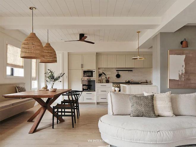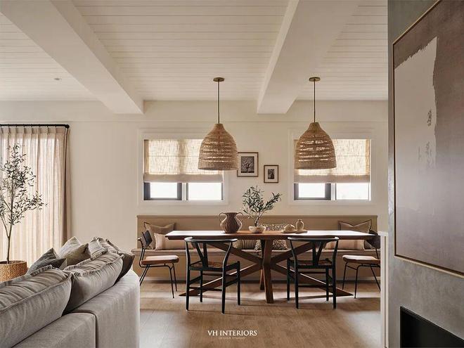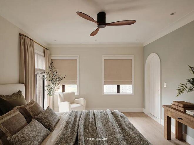 引入卧室,采用大地色调与绿系的跳色手法相衬