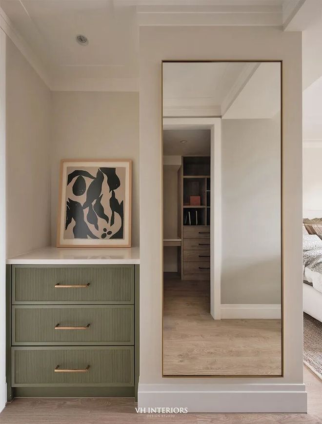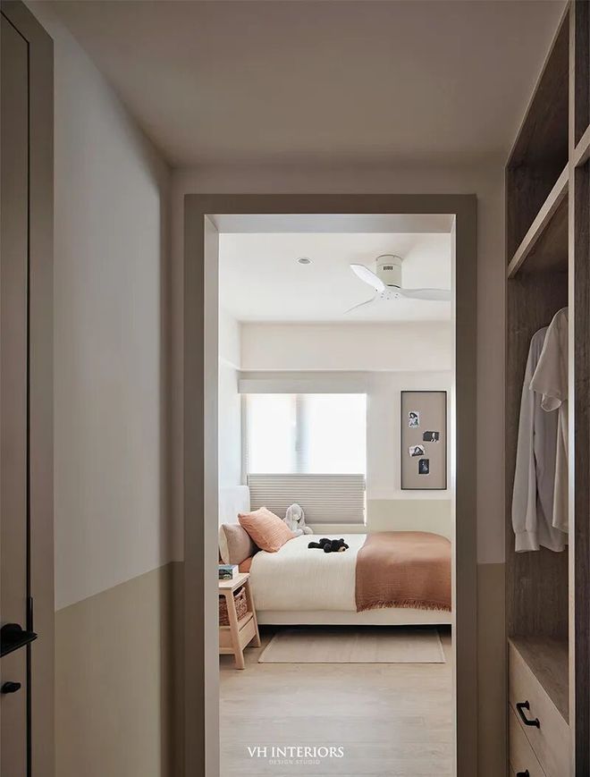 引入卧室,采用大地色调与绿系的跳色手法相衬