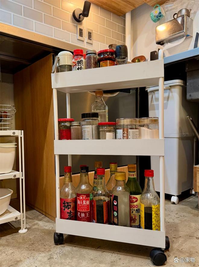 架子旁边则放一组三层窄推车,收纳各种瓶瓶罐罐之类的调味品刚好合适,平时塞到角落里不显山不露水,做饭的时候抽出来,也方便随手拿取,可谓是兼顾美观和实用性。