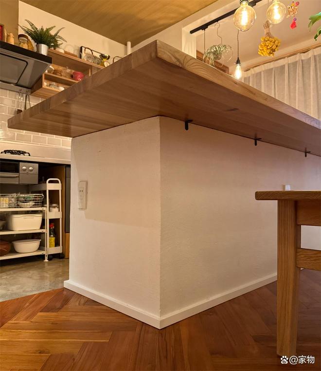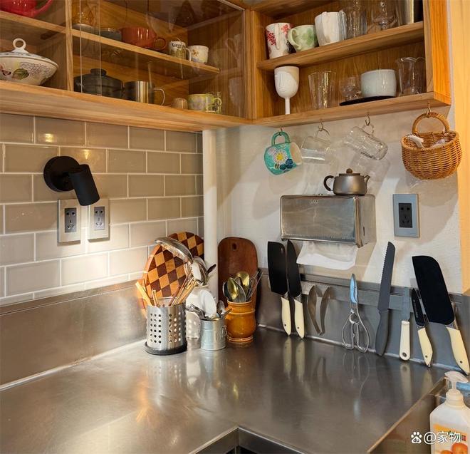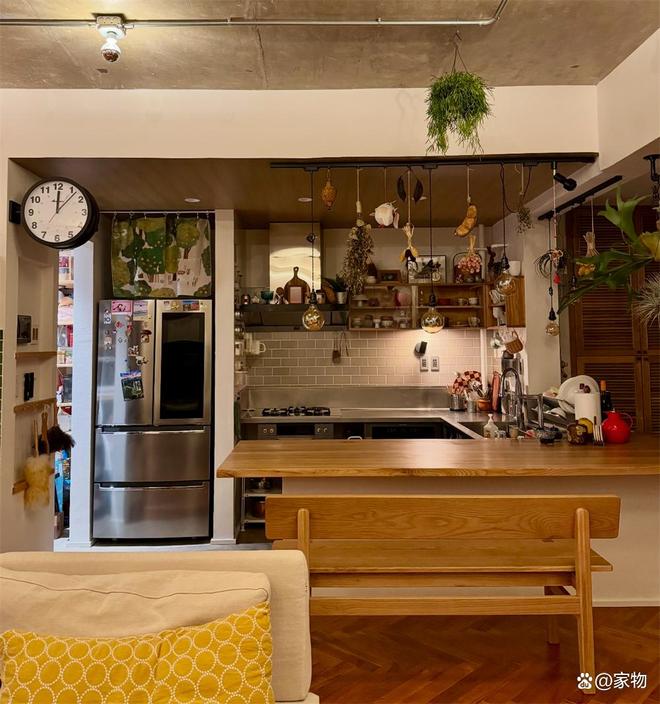 就拿这间比较经典的开放式无橱柜厨房举例(@花花在家),虽说面积不大、东西不少,但做成无橱柜厨房后却又好看又实用,太有烟火气儿了~