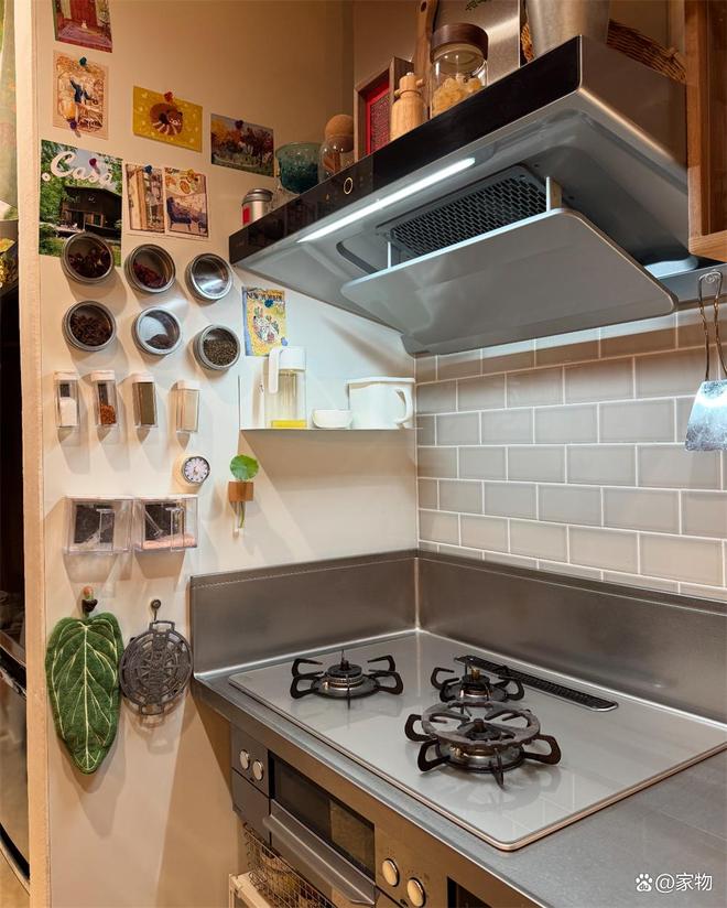 灶台旁边的墙面做了一面磁吸墙,用各种各样的小号磁吸调味品瓶收纳盐糖胡椒粉等物,做饭时顺手就能拿到。