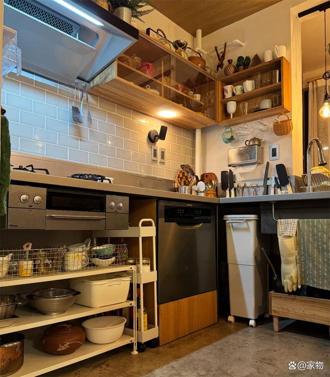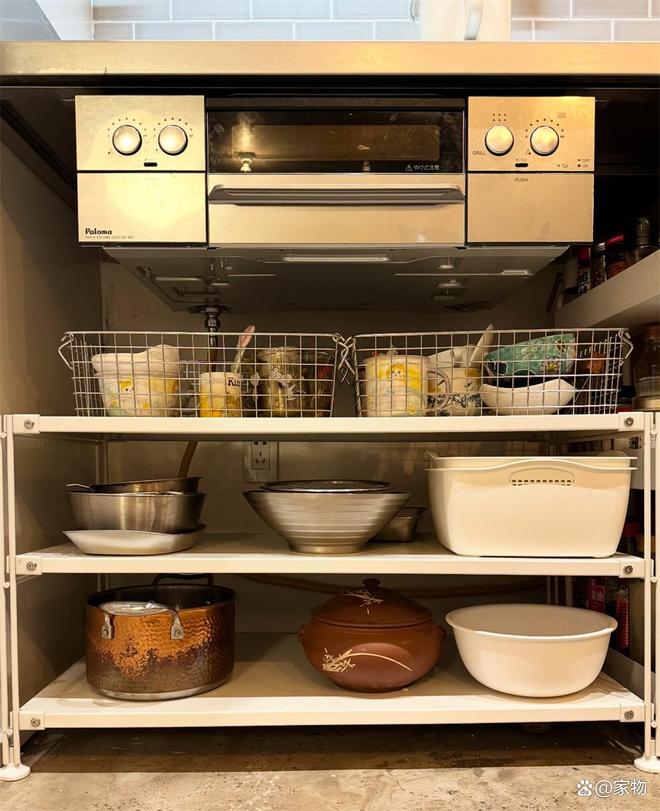 就拿这间厨房来说,直接安装日式燃气灶,底部带个小型烤鱼炉悬在半空,再往下则是三层置物架,放些经常用到的锅具和盛菜碗碟,看到没,只要摆放整齐,即便这些餐具较多也不会显得太过杂乱。