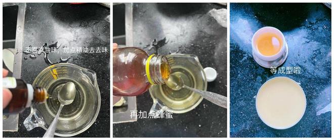 2)化开后加入精油和蜂蜜,最后倒模冷却,等成型就好了。