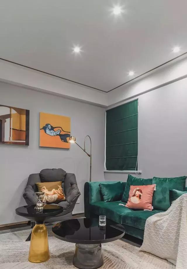 客厅的双人沙发和单椅结合,角落里还摆放了一个铜质金属的落地灯,孔雀绿的沙发搭配镜面的茶几,营造出复古而又优雅的感觉。