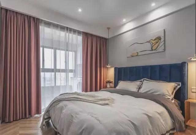次卧连通了阳台空间,用推拉门来分开两个空间。粉色的窗帘搭配深蓝色的床头靠背,让人感觉静谧而又优雅浪漫。