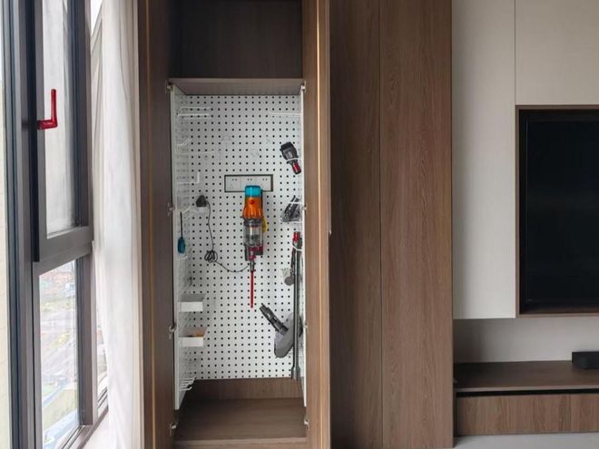 装好以后,你会发现家里所有的清洁工具,包括吸尘器,甚至配件,通通都能悬挂在洞洞板上。