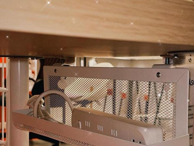 我家这次装修,媳妇给出的解决方案:桌下抽屉式插排收纳盒,再配上理线器。