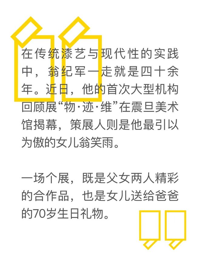 他们的分歧,更多时候是一种良性的工作氛围:父亲偏重大漆材质的特色,女儿则“总结为理论与叙事”,但在漆艺的当代表达上,父女的观点是一致的。翁纪军靠长期积累的工序知识与物质直觉,他知道如何把一个“好状态”留在材料里,如何让漆在时间中呈现出生命的指纹。