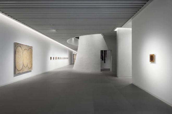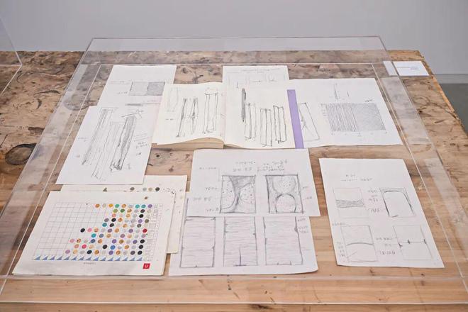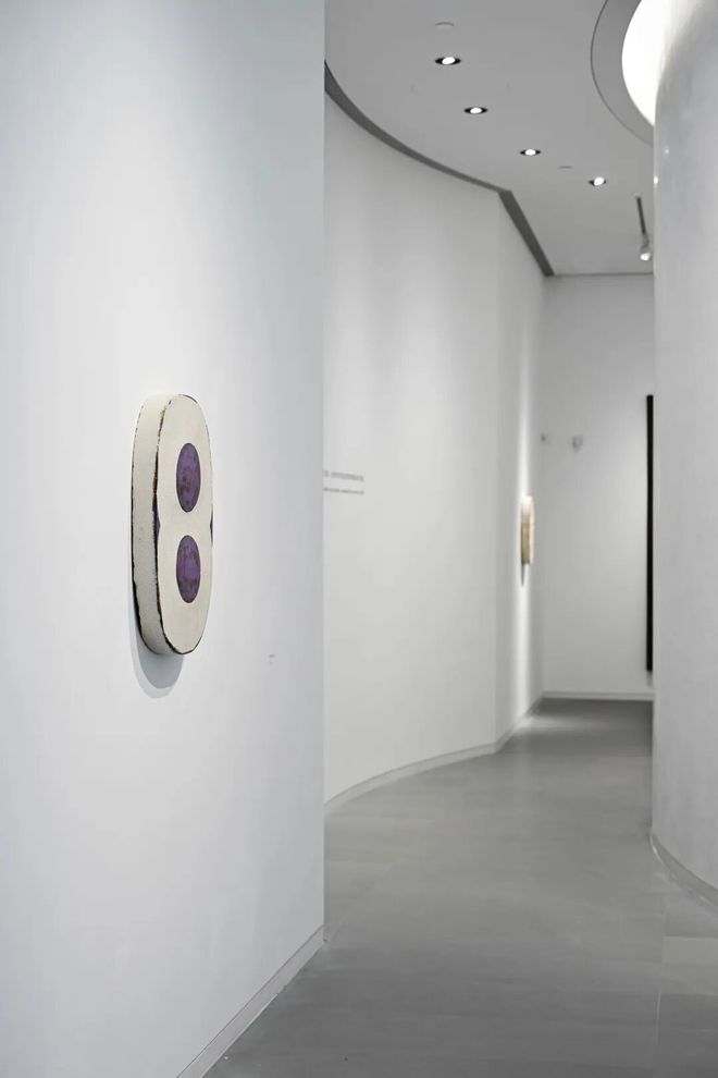 作为艺术家的父亲和作为策展人的女儿两个人,工作上的首次合作就是这次展览“物·迹·维”。观众进入展厅,首先看到的是若干大型“集聚”系列作品与数件带有工序痕迹的中小型作品,近距离可见多层髹涂后的色层结构、粉棒草稿与漆膜反光在不同光照下的变换;远观时,整体图像又以圆与点的结构引发观者对微观/宏观关系的想象。色层磨显、物质颗粒与漆膜反射在不同光照里变换,松紧结合,节奏分明。