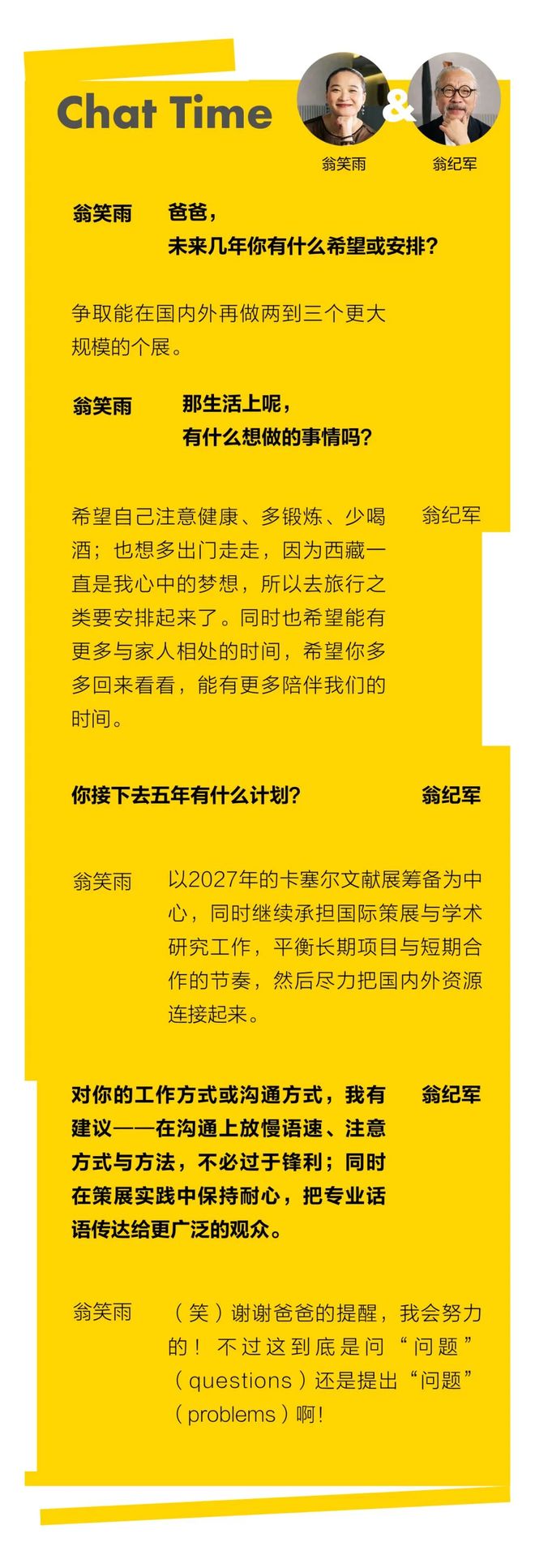 整个采访中,他们的对话里总让人感受到某种上海式家庭特有的气质:不说教、也不深情,而是用一种近乎戏谑的方式包裹着深切的关怀。翁笑雨评价父亲的词语是“执着、认真、坚持”;而父亲也不会羞于表达骄傲:对女儿的语言能力、学术训练、以及在国际平台上的实践感到自豪。当女儿提到卡塞尔文献展即将进入忙碌的筹备期,父亲翁纪军就会冷不丁提出期望:“那你的终身大事有什么安排?”