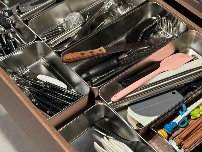 具体的做法是厨房的地柜80%以上都可以安装抽屉,采用抽屉式设计。而对于一些电器收纳柜,可以采用全拉出式的层板,衣柜也可以配备多规格的抽屉。