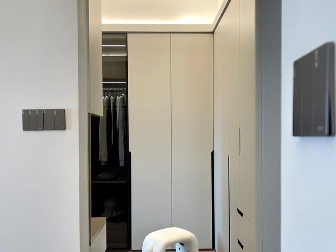 装修建议:通顶的柜门,建议大家采取分段式设计,一般可以分成2~3段,效果会更好。柜门的材料一定要选择易清洁、耐污染的饰面材料。